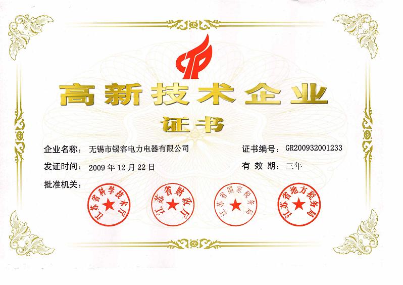 2009年12.22日,無錫市錫容電力電器有限公司獲取高新技術(shù)企業(yè)證書,批準(zhǔn)機(jī)關(guān):江蘇省科學(xué)技術(shù)廳、江蘇省財政廳、江蘇省國家稅務(wù)局,江蘇省國家稅務(wù)局